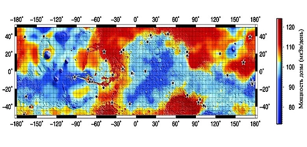 На основе этой карты была составлена таблица доз для районов-кандидатов на возможные места посадок будущих пилотируемых экспедиций, которые ранее были предложены мировым сообществом. Показано, что в максимуме потока ГКЛ мощность нейтронной дозы может составлять от 85 до 145 мкЗв/сут в зависимости от выбранного места посадки. Существенное влияние на величину дозы оказывает наличие в грунте подповерхностной воды (изменение дозы на 25%) и локальная толщина атмосферы (изменение дозы на 15%). Сезонные вариации атмосферы почти не влияют на величину дозы (изменение дозы не более 4-6%).