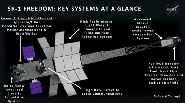 24 марта 2026 года NASA объявило, что планирует до конца 2028 года запустить в космос аппарат Space Reactor-1 Freedom, который должен стать первым демонстрационным межпланетным аппаратом с ядерной электродвигательной установкой. Она будет оснащена ядерным реактором с электрической мощностью более двадцати киловатт, который будет работать на топливе из высококонцентрированного диоксида урана с содержанием изотопа 235U от пяти до двадцати процентов. Радиационная защита реактора будет выполнена из карбида бора, а вырабатываемая электроэнергия будет питать ксеноновые ионные двигатели. В состав аппарата также войдут система преобразования тепловой энергии реактора в электрическую энергию, охладители, система связи и навигации, а также солнечные батареи.