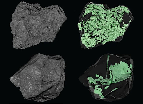 На изображение выше представлены два разных ракурса двух небольших фрагментов породы, доставленных зондом OSIRIS-REx с астероида Бенну. Для их изучения специалисты NASA использовали рентгеновскую компьютерную томографию — особый метод, позволяющий исследовать внутреннюю структуру объектов без их разрушения.