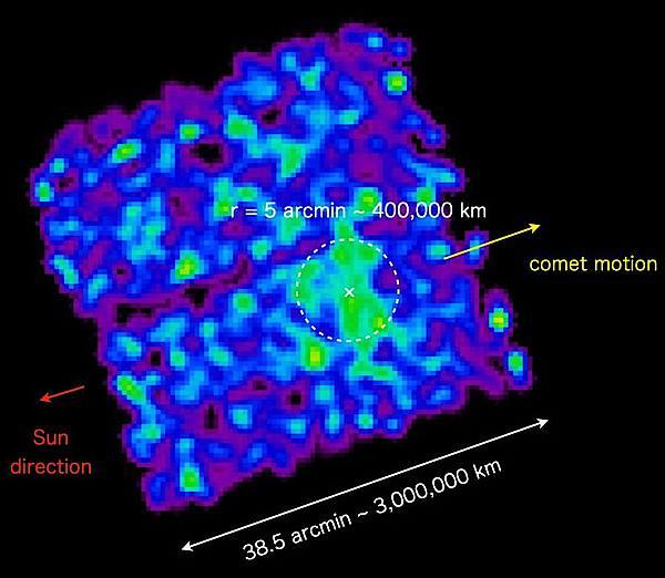 В начале декабря к наблюдениям подключилась обсерватория XMM-Newton. В течение примерно 20 часов она изучала комету с расстояния около 280–285 миллионов километров, используя чувствительный инструмент — камеру EPIC-pn. На изображениях видно отчетливое рентгеновское свечение, окруженное более слабыми структурами. Эти области соответствуют зонам взаимодействия солнечного ветра с газами, уходящими от кометы.