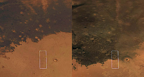Если потемнение действительно связано с распространением пепла, то происходит это с поразительной скоростью. Сравнение снимков, сделанных орбитальными аппаратами программы Viking в 1976 году, с новыми изображениями Mars Express показывает, что за последние 50 лет темная область заметно расширилась. По оценкам ESA, это на порядки быстрее, чем большинство других видимых изменений на поверхности Марса, которые обычно происходят в течение миллионов лет.