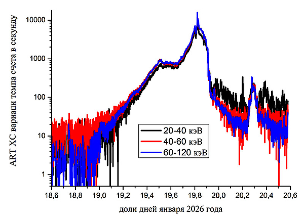 Большое усиление потока протонов зарегистрировали и детекторы телескопа ART-XC им М. Н. Павлинского на борту российской обсерватории «Спектр-РГ», которые «видят» вторичное рентгеновское излучение от взаимодействия солнечных протонов с космическим аппаратом (нижний рисунок). Оно превысило максимальные наблюдавшиеся до этого телескопом ART-XC значения 11–12 ноября 2025 г. более, чем в 1.5 раза.