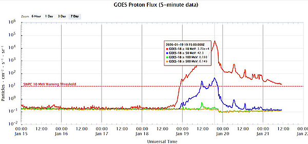 Более того, протонов относительно высоких энергий оказалось гораздо меньше, чем низких. Максимальная энергия протонов в момент самого большого максимума 19 января 2026 года не превышала 100 МэВ. И это тоже свидетельствует об очень интересных механизмах распространения протонов и облака плазмы. А с практической точки зрения нам всем очень повезло, ведь именно протоны с энергией более нескольких десятков МэВ наиболее опасны для электроники космических аппаратов, так как проникают через металлические стенки.