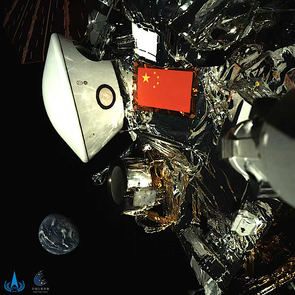 На недавно опубликованном снимке, полученном камерой наблюдения, установленной на роботизированном манипуляторе зонда, хорошо видны пятизвездочный красный флаг КНР и белая возвращаемая капсула на фоне далекой голубой Земли.