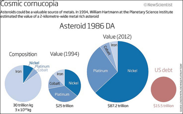 Уже через пару лет Planetary Resources обещает начать запуск телескопов, которые выберут наиболее подходящие для разработки астероиды. Больше того: Moon Express, стартап из Лас-Вегаса, тоже заявил о своей заинтересованности в освоении космических богатств — на этот раз Луны.