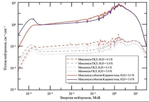 Спектральная плотность потоков нейтронного излучения лунного грунта с разной концентрацией водяного льда под воздействием ГКЛ и во время мощных СПС типа события Кэррингтона. Изображение из статьи И.Г. Митрофанов и др., 2025.