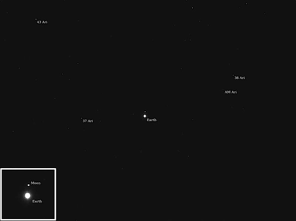 В конце июля этого года камеры зонда сделали несколько кадров нашей планеты с длительной выдержкой (до 10 секунд). Земля и Луна на них выглядят как сверкающие точки среди звездного поля.