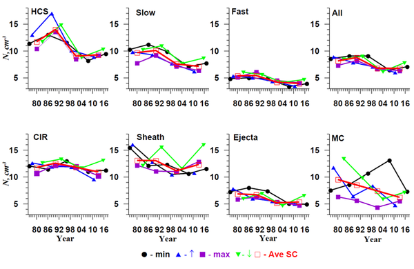 В недавней статье, опубликованной в журнале Journal of Geophysical Research: Space Physics, группа сотрудников ИКИ РАН под руководством Юрия Ермолаева проанализировала параметры солнечного ветра с учетом всех факторов: типа явления солнечного ветра, фазы солнечного цикла и номера солнечного цикла. В итоге исследователи получили количественные результаты об изменении параметров солнечного ветра на протяжении четырех последних солнечных циклов с учетом наблюдений различных типов «спокойного» и возмущенного солнечного ветра.