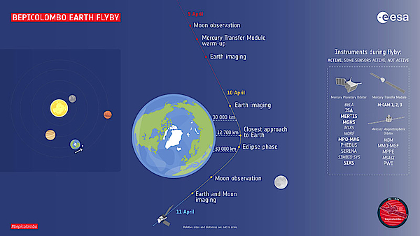 «БепиКоломбо», совместная миссия Европейского космического агентства и Японского аэрокосмического агентства с участием широкой международной кооперации, включает два космических аппарата: европейский Mercury Planetary Orbiter (MPO) и японский Mio, — которые на этапе перелёта находятся «в связке». После запуска 20 октября 2018 г. «БепиКоломбо» двигался по гелиоцентрической орбите, близкой к земной, и 10 апреля 2020 г. в 07:25 мск приблизился к Земле на расстояние около 12700 км. В это время благодаря взаимодействию с гравитационным полем Земле его скорость снизилась примерно на 5 км/сек, и таким образом «БепиКоломбо» был переведен на более низкую гелиоцентрическую орбиту, двигаясь по которой, он постепенно «спустится» к Венере, а потом и к Меркурию. При этом практически не потребовалось тратить топливо на торможение, хотя двигатели КА также включались несколько раз для небольших коррекций траектории.